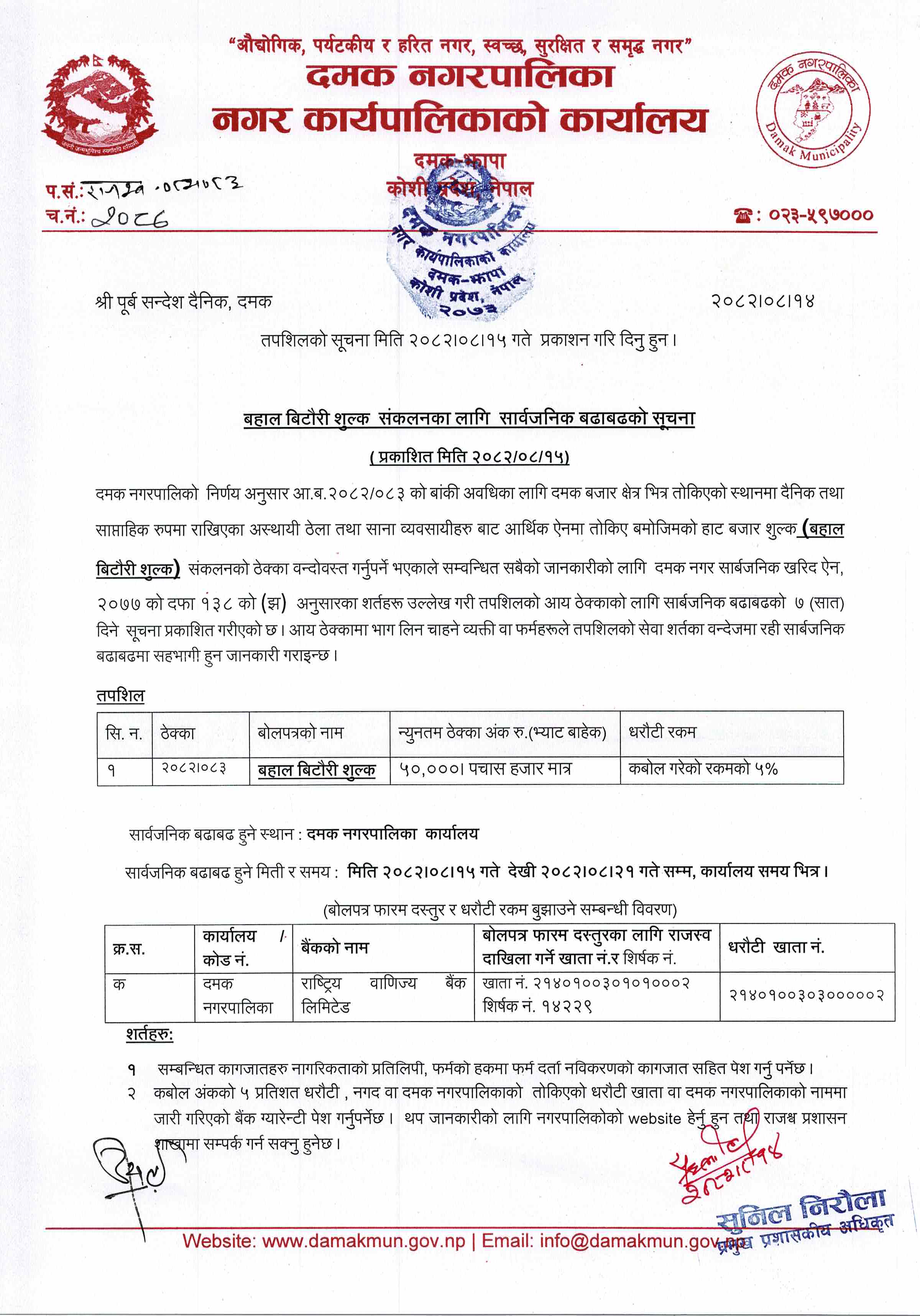 बहाल बिटौरी शुल्क संकलनका लागी सार्वजनिक बढाबढको सूचना ।