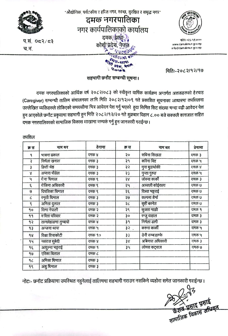 Caregiver तालिमका लागि सहभागी छनोट सम्बन्धी सूचना।