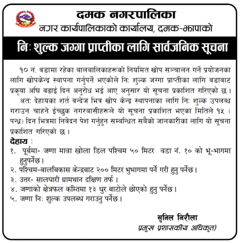 निः शुल्क जग्गा प्राप्तिका लागि सार्वजनिक सूचना ।