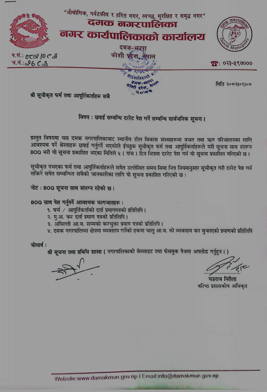 दमक १० को पूर्वाधार निर्माण सम्बन्धी आर्थिक प्रस्ताव पेश गर्ने सार्वजनिक सूचना