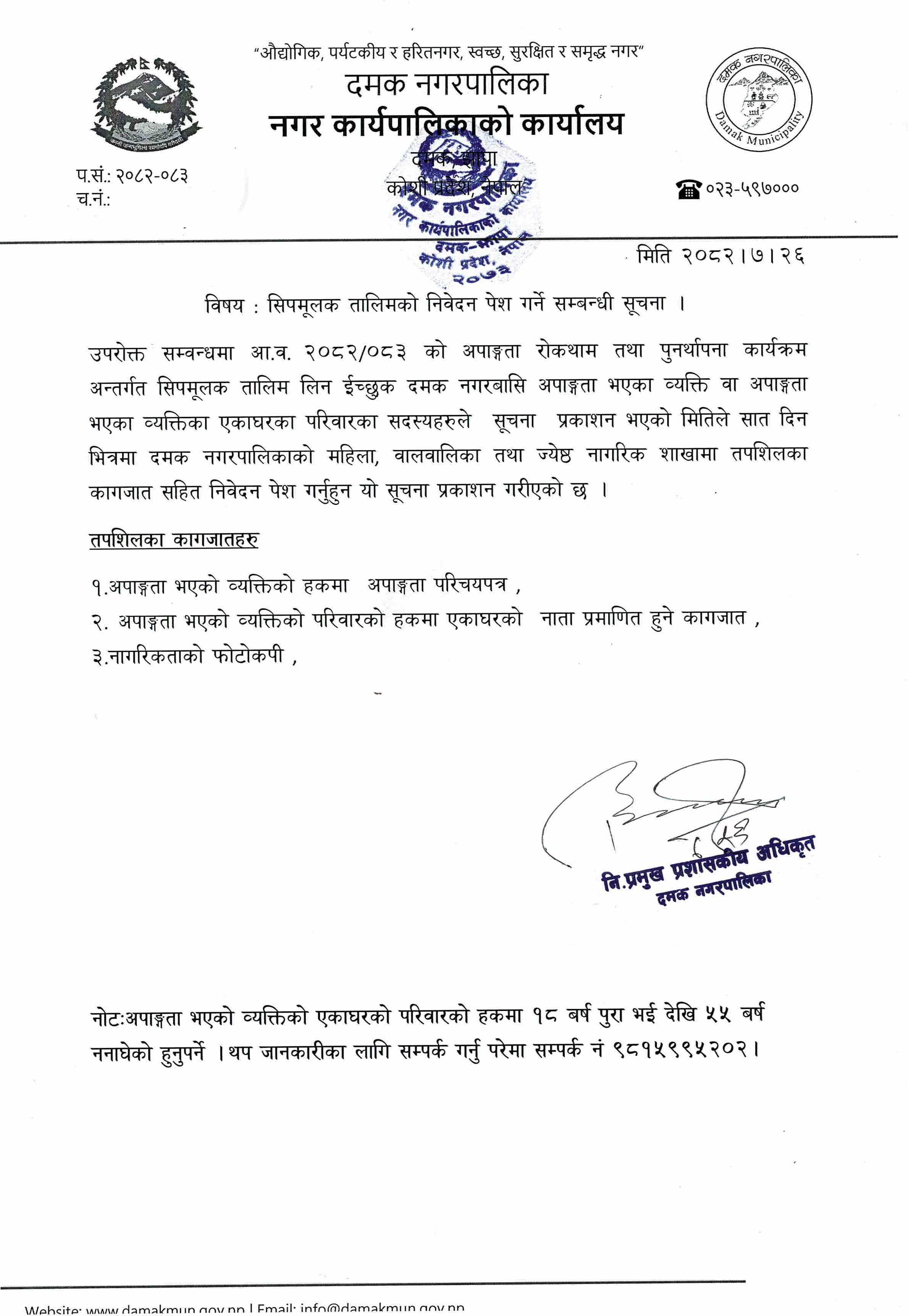 सिपमूलक तालिमको निवेदन पेश गर्ने सम्बन्धी सूचना ।